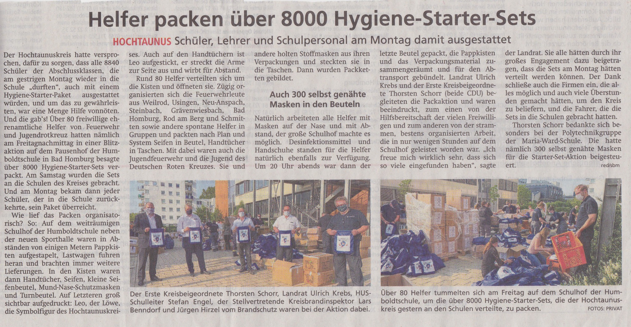 Damit die Schülerinnen, die wieder in die Schule gehen dürfen, auch gut ausgestattet sind und die Hygienevorstellungen leicht einhalten können, bekommen alle ein sogenanntes Starterset: In einem Beutel, den man wie einen Rucksack aufsetzen kann, befinden sich ein Handtuch, ein Stück Seife, ein Mundschutz und ein kleines Beutelchen für die Seife. In der Taunuszeitung wurde am 27.04.2020 darüber berichtet. Lest selbst!