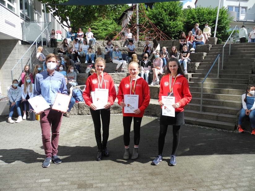 Die Preisverleihung an der SAS durch Herrn Zalud und Herrn Weimar fand am 7. Juli statt; Reihenfolge v.l.n.r.: Herr Gluth, Sophie Grawenhoff, Jacqueline Wandel, Johanna Fröhlich; ohne Abbildung: Mia Barton, Foto: L. Schütz