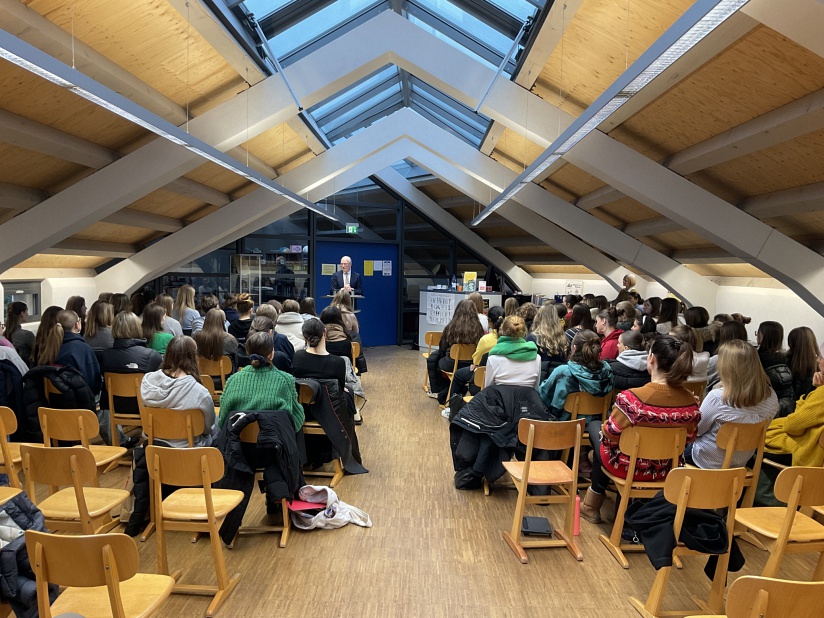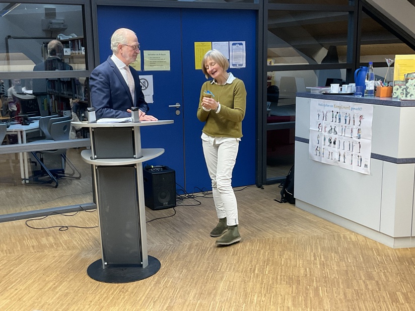 Kurz vor den Weihnachtsferien 2023/24 durfte die gesamte E-Phase an einer besonderen Veranstaltung hinsichtlich der deutschen Sprache teilnehmen: Der Sprachwissenschaftler Prof. Dr. Roland Kaehlbrandt war in der Bibliothek zu Besuch, um einen Vortrag über unsere Sprache zu halten. Unwissend, was auf uns zukommen würde, und teilweise doch relativ sicher, dass es ein monologischer und für die ein oder andere langweiliger Vortrag werden würde, fanden wir uns nach und nach im Dachgeschoss von Haus C ein. Doch anders als gedacht, erwartete uns keine einseitige Lesung aus seinem 2022 erschienen Buch „Deutsch – Eine Liebeserklärung. Die zehn großen Vorzüge unserer erstaunlichen Sprache“, sondern stattdessen wurden wir gleich zu Beginn mit in den Vortrag einbezogen.