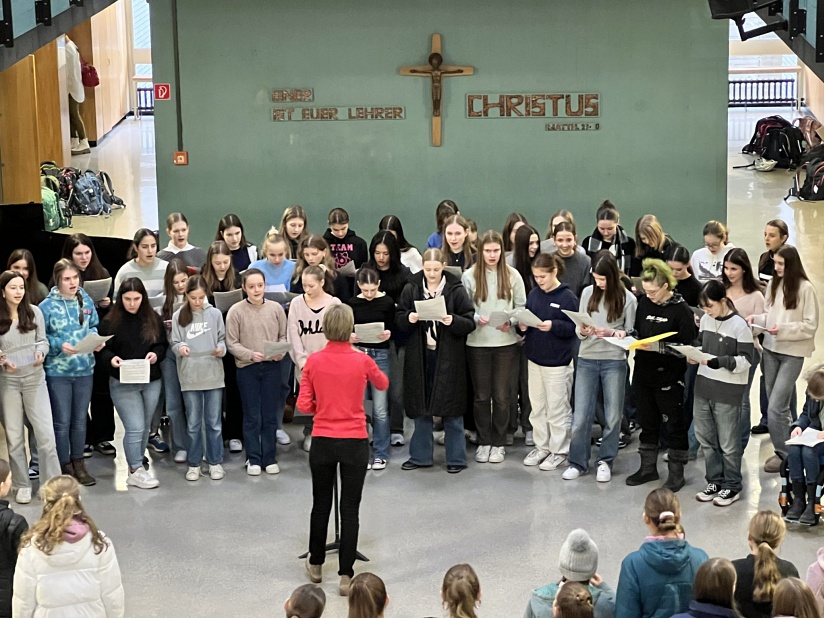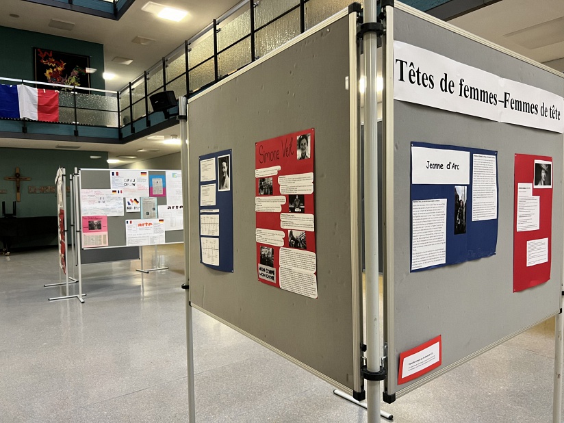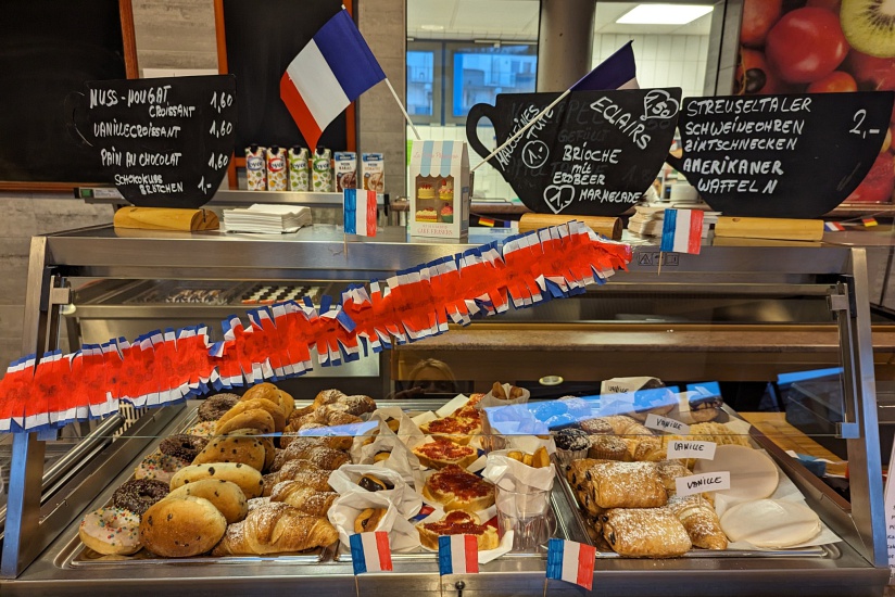 Wenn das Bistro in französischen Farben erstrahlt und ein Duft von Crêpes durch das Schulhaus zieht, dann weiß man: Heute begehen wir den deutsch-französischen Tag an unserer Schule. An diesem Tag wird die deutsch-französische Freundschaft gefeiert und an die Unterzeichnung des Elysée-Vertrags im Jahr 1963 erinnert. Eine Ausstellung in der Halle zeigt die wechselvolle Geschichte der beiden Länder, eine weitere Ausstellung präsentiert Porträts berühmter Französinnen aus Geschichte, Kunst, Literatur und Politik. Ein besonderes Highlight war in diesem Jahr die musikalische Darbietung des Pausenchors, der mit Liedern aus dem bekannten französischen Film Les Choristes (dt. Die Kinder des Monsieur Mathieu) begeisterte. Das FranceMobil brachte ein Stückchen Frankreich ins Klassenzimmer; Schülerinnen der 7. und 8. Klassen konnten dabei ihre Französischkenntnisse im Austausch mit einer französischen Muttersprachlerin ganz spielerisch erproben. Eine Leseinsel mit französischen Comics bot Gelegenheit, die Vielfalt der französischen BDs kennen zu lernen. Ganz im Zeichen der deutsch-französischen Freundschaft stand außerdem ein Kurzfilm über unsere Schule; fünf französische Schülerinnen waren von Oktober bis Dezember zu Gast bei ihren Austauschschülerinnen der G9c, haben den Unterricht besucht und in einem Video ihre Erfahrungen und Erlebnisse an unserer Schule geteilt. Vive l’amitié franco-allemande.