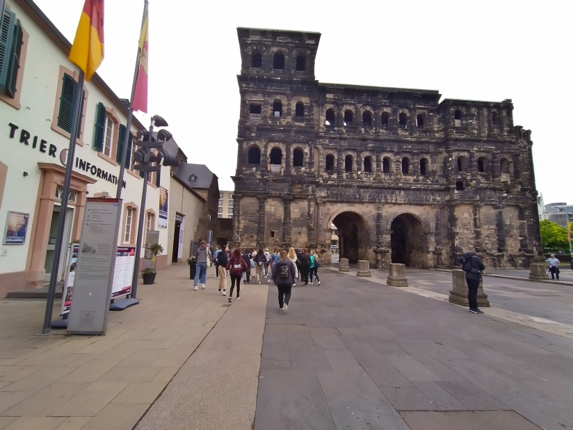 Erstmalig Halt machten wir bei der Porta Nigra; diese konnten wir eigenständig erkunden, nachdem wir – wie zu allen Sehenswürdigkeiten – eine Kurzpräsentation gehört hatten. Die Porta Nigra erhielt ihre schwarze Färbung und somit ihren Namen deshalb, weil Umwelteinflüsse den ehemals weißen Sandstein im Laufe der Jahrhunderte schwarz gefärbt hatten. Die nächste Sehenswürdigkeit war der beeindruckende Trierer Dom mit angegliederter Liebfrauenkirche. Der pompöse Dom hinterließ bei vielen nicht nur Eindruck, sondern erinnerte die meisten von uns auch an die zuvor in den Osterferien besuchten römischen Kirchen. Als Nächstes besichtigten wir die Konstantinbasilika, die besonders stark die Prägung der Stadt durch Konstantin den Großen zeigt.