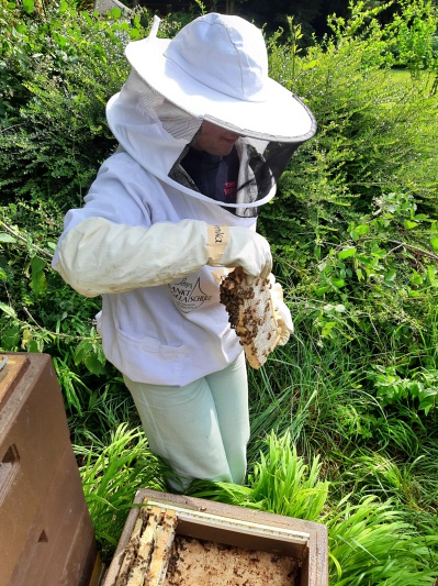 Beim Umgang mit den Bienen standen die Mädels der Imker AG immer wieder vor dem Problem, dass die mit Honig gefüllten Honigräume zu schwer waren, um sie selber abheben zu können. Auch eine einzelne Honigwabe mit einer Hand zu halten, um die Bienen mit dem Abkehrbesen von der Wabe zu entfernen, gestaltete sich für viele der Mädchen äußerst schwierig. Um das Problem des Gewichts zu lösen, kamen Herr Rupp und Herr Herrmann überein, in der Saison 22/23 versuchsweise bei einem Volk mit Halbzargen zu arbeiten. Leider hatten die Bienen, im Gegensatz zu dem Vergleichsvolk mit normaler Wabengröße, überhaupt keine Lust sich in den Honigraum mit den Halbzargen zu begeben. Um sie zu locken griff die Imker AG in die Imker-Trickkiste. Eine normale Wabe mit verdeckelter Brut wurde in die obere Halbzarge eingehängt und reichte bis in die untere Halbzarge. Die Brut lockte die Bienen aus dem Brutraum an und ab sofort wurde fleißig Honig in die halbhohen Waben eingetragen. Nach der ersten Schleuderung wurde die eingehängte Wabe durch 2 Halbrähmchen ersetzt. Ein Blick in die Honigräume letzte Woche machte klar, es muss eine Zwischenschleuderung geben. Alle Waben in beiden Zargen waren voll verdeckelt, kein Platz für einen weiteren Honigeintrag und das bei guter Trachtlage. Bei der aktuellen Schleuderung könnten die Jungimkerinnen jetzt tatsächlich selbstständig die gefüllten Halbzargen abnehmen und auch das Abkehren der Bienen von den Waben war mit der neuen Wabengröße kein Problem mehr. Der Versuch mit der neuen Wabengröße kann also unter dem Strich als absolut gelungen bezeichnet werden. In der nächsten Saison werden daher alle Völker nur noch Halbzargen als Honigräume erhalten. Zuerwerben gibt es den leckeren Uschi Gold Honig bereits am Hoffest. Der Ertrag des Honigverkaufs fließt in das Sambia-Projekt der Imker AG und wird weiteren Farmerfamilien den Einstieg in die Imkerei ermöglichen.