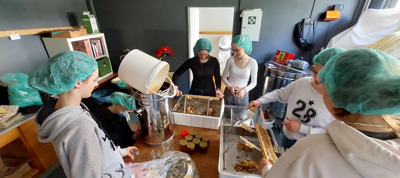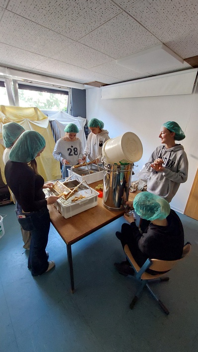 Goldgelb fließt der Honig aus der Schleuder, nachdem die Imkerinnen der Imker AG die Waben mit der Entdecklungsgabel von den schützenden Wachsdeckeln über den Honigzellen befreit hatten. Gerne hätten alle direkt Honig mit nach Hause genommen. Geht aber nicht! Der abgefüllt Honig wird erst am Hoffest verkauft. Der Ertrag aus dem Honigverkauf soll in Sambia in Bienenkästen investiert werden. Diese werden an Farmerfamilien im Bienenprojekt verteilt und ermöglichen eine spürbare Verbesserung deren Lebenssituation über das zusätzliche Einkommen aus der eigenen Imkerei. Aber so ganz ohne eine Honiggabe sollten die fleißigen Imkermädels dann doch nicht entlassen werden! Die Bienen in der Top Bar Hive, eine Bienenwohnung wie sie auch in Sambia genutzt wird, hatten bereits in den frisch gebauten Randwaben reichlich Honig eingetragen. Diese Waben können nicht geschleudert werden, sondern müssen vom Oberträger abgeschnitten und gepresst werden. Alternativ kann man sie aber auch „am Stück“ essen. Und so kam jede Imkerin in den seltenen Genuss eines Stücks Honigwabe aus der TBH. Einfach lecker!