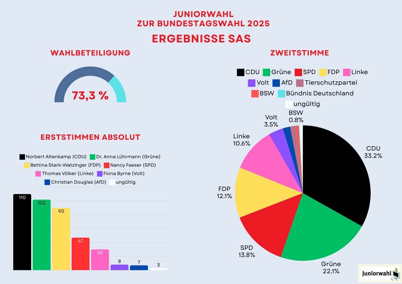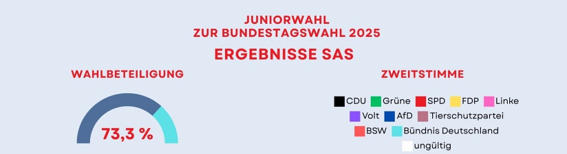 Passend zur Bundestagswahl am 23.2.25 konnten nun auch die Ergebnisse der Juniorwahl an der SAS veröffentlicht werden. Bei einer Wahlbeteiligung von 73,3 % konnte sich die CDU die meisten Stimmen sichern (33,2 %). Dahinter folgten: Die Grünen (22,1 %), SPD (13,8 %), FDP (12,1 %) und Die Linke (10,6 %). Die restlichen Parteien hätten die 5 %-Hürde nicht überschritten. Die meisten Erststimmen erhielt wie auch in der „echten“ Wahl Norbert Altenkamp (CDU). Die Durchführung der Juniorwahl war für uns Schülerinnen eine tolle Möglichkeit unsere politische Meinung zu teilen sowie ein politisches Meinungsbild der Schule zu bekommen.