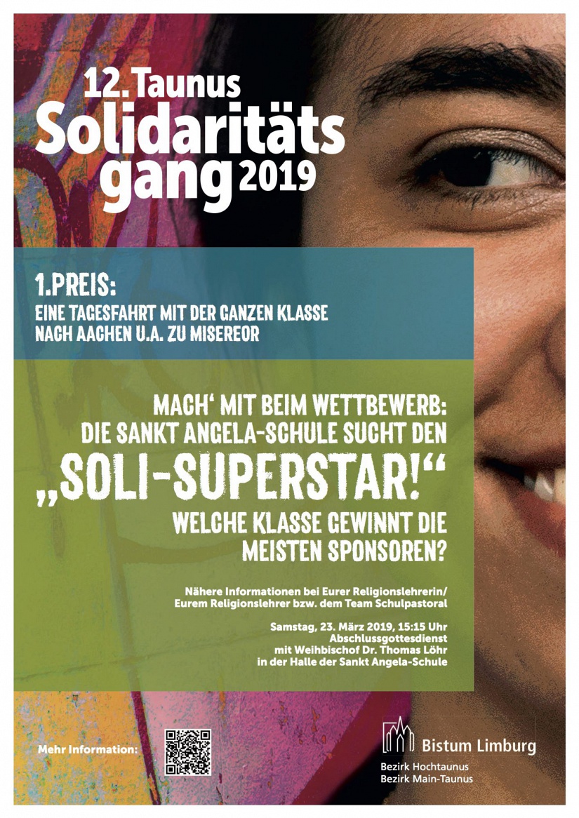 Alle zwei Jahre machen sich Mitglieder der Pfarrgemeinden des Main- und des Hochtaunuskreises zu einem Sternmarsch der besonderen Art auf. Jeder Läufer sucht sich Sponsoren, die die gelaufenen Kilometer mit einer finanziellen Spende honorieren. Die auf diese Weise erlaufene Geldsumme wird in vielen, von Misereor betreuten, sozialen Projekten in der ganzen Welt investiert. Der Sternmarsch führt traditionell zur St. Angela-Schule, wo ein Abschlussgottesdienst stattfindet. In die Vorbereitung des Solidaritätsgangs ist immer auch ein Team der St. Angela-Schule, bestehend aus Lehrerinnen und Lehrern und aus Schülerinnen eingebunden.