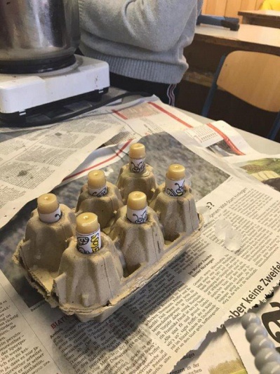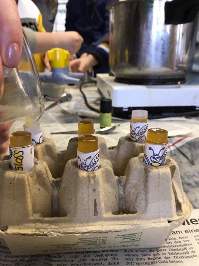 Mit Hochdruck haben sich die Mädchen der Imker-AG sich an die Herstellung von neuen Lippenpflegestiften gemacht. Aus wertvollen Ausgangsprodukten, Sheabutter, Kokosfett und Bienenwachs ensteht ein hochwertiger Lippenbalsam ohne Zusatzstoffe. Einzig Limetten- oder Minzöl sorgen für einen angenehmen Geruch. Das Bienenwachs wurde selbstverständlich zuvor von einem Analyselabor auf mögliche Pestizide oder Varroabehandlungsrückstände getestet und zusätzlich in einem eigenen Gerät desinfiziert. Nachdem alle Zutaten im Wasserbad verflüssigt wurden, erfolgte unter höchster Konzentration das Einfüllen in die schmalen Lippenstifthülsen. Fingerspitzengefühl, bei trotzdem zügigem Arbeiten, war hier erforderlich. Wer zu lange zögert hat schon verloren: Das Material erstarrt im Glas. Auch zittrige Hände sind verboten, will man die Hülsen nicht verunreinigen. Mit dem flotten Uschi-Balm-Etikett versehen, warten die Pflegestifte auf ihre Abnehmerinnen.