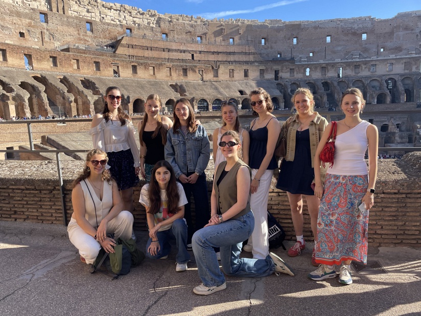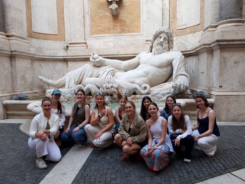 Die Romreise der Lateinerinnen der Oberstufe mit Frau Lief und Frau Ruhl begann früh am Morgen des 12. Oktober. Nach unserer Ankunft um 11 Uhr stürzten wir uns sofort ins Stadtleben. Zunächst besuchten wir die Piazza Navona, die Kirche Sant’ Andrea della Valle und die Piazza Campo de’ Fiori. Auch der Trevi-Brunnen und der Kapitolsplatz standen auf dem Plan, bevor wir den Tag mit einem Blick auf das Pantheon abschlossen, das wir, wie eigentlich geplant, leider noch nicht besuchen konnten.