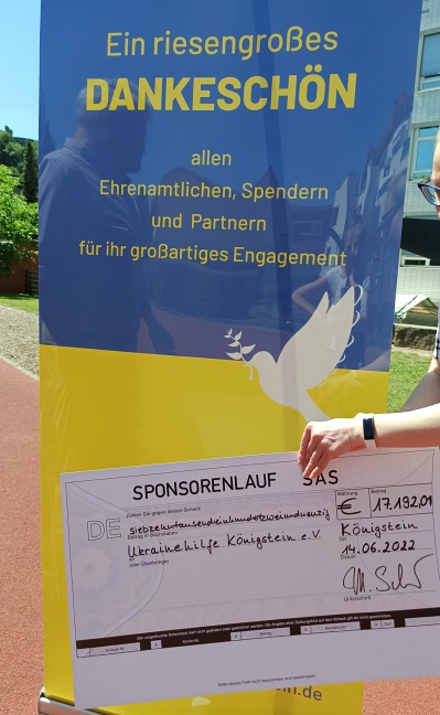 Der Scheck in Höhe von rund 17.000 Euro konnte am 14.6. voller Stolz von Herrn Schuler an die Ukrainehilfe Königstein überreicht werden. Was für ein Erfolg !!!!